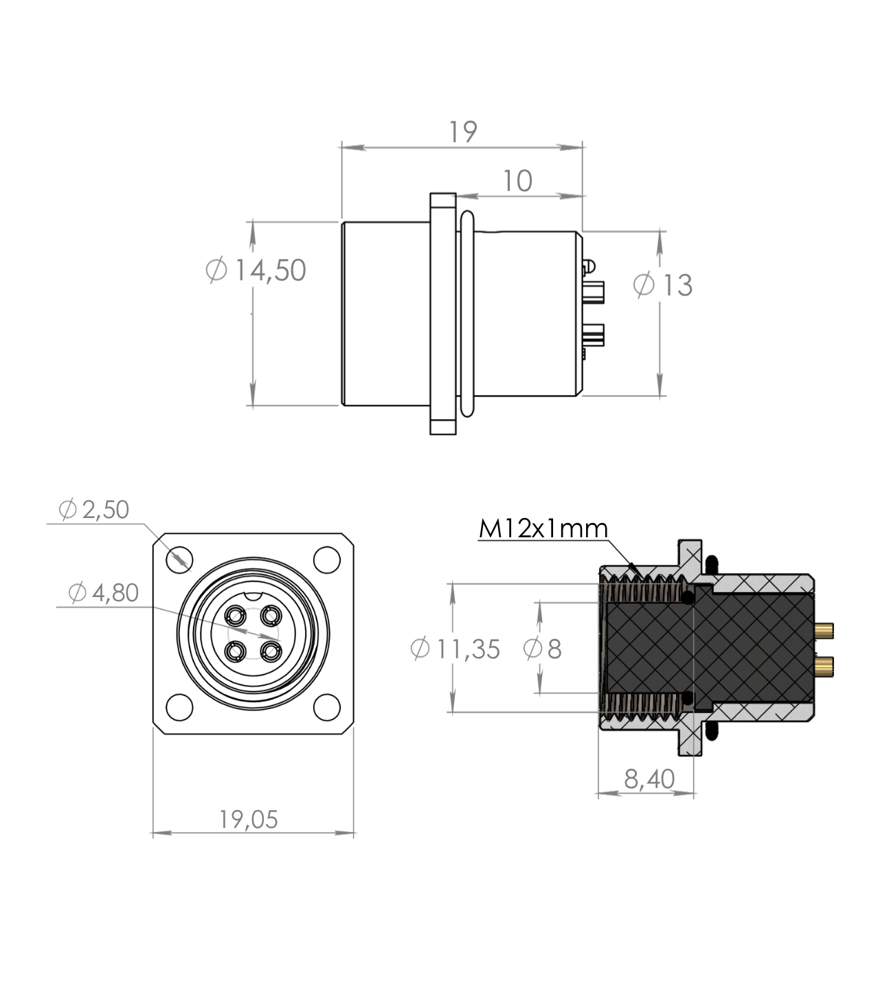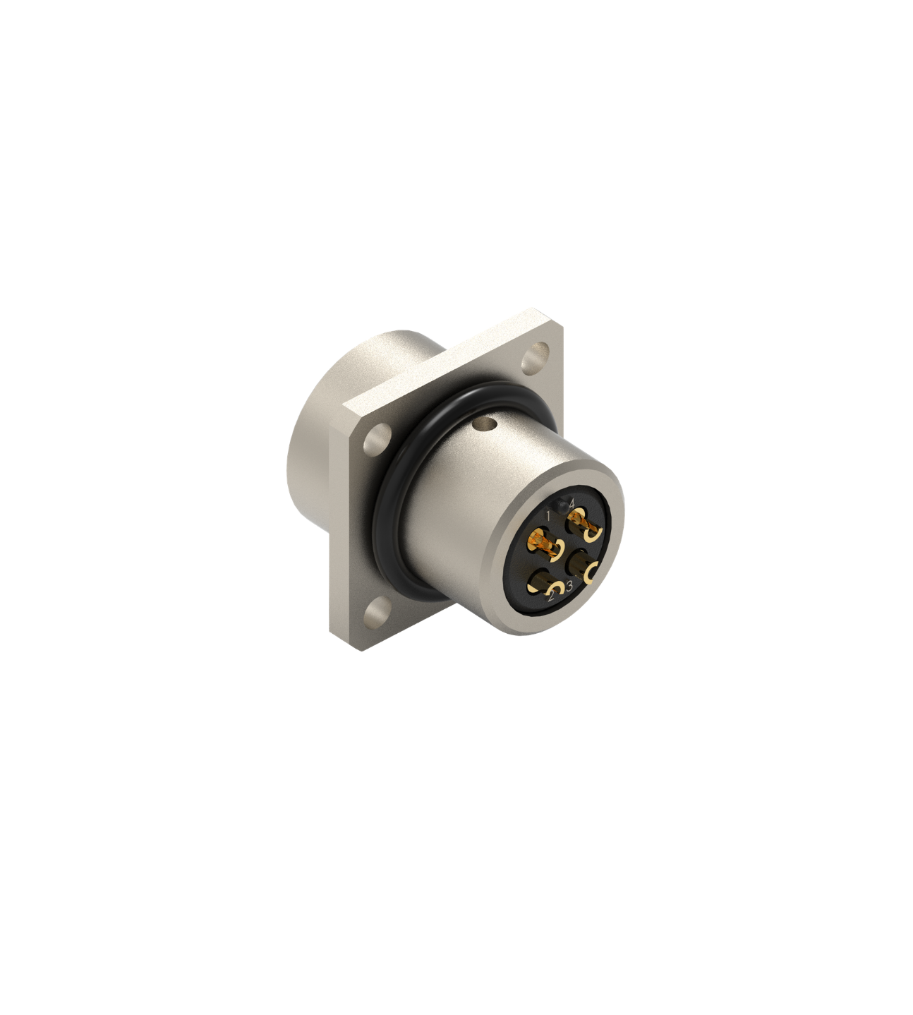 CONECTOR BASE QUADRADA CIRCULAR M12 – 1 AMPERE – FÊMEA – IP67 – LATÃO NIQUELADO