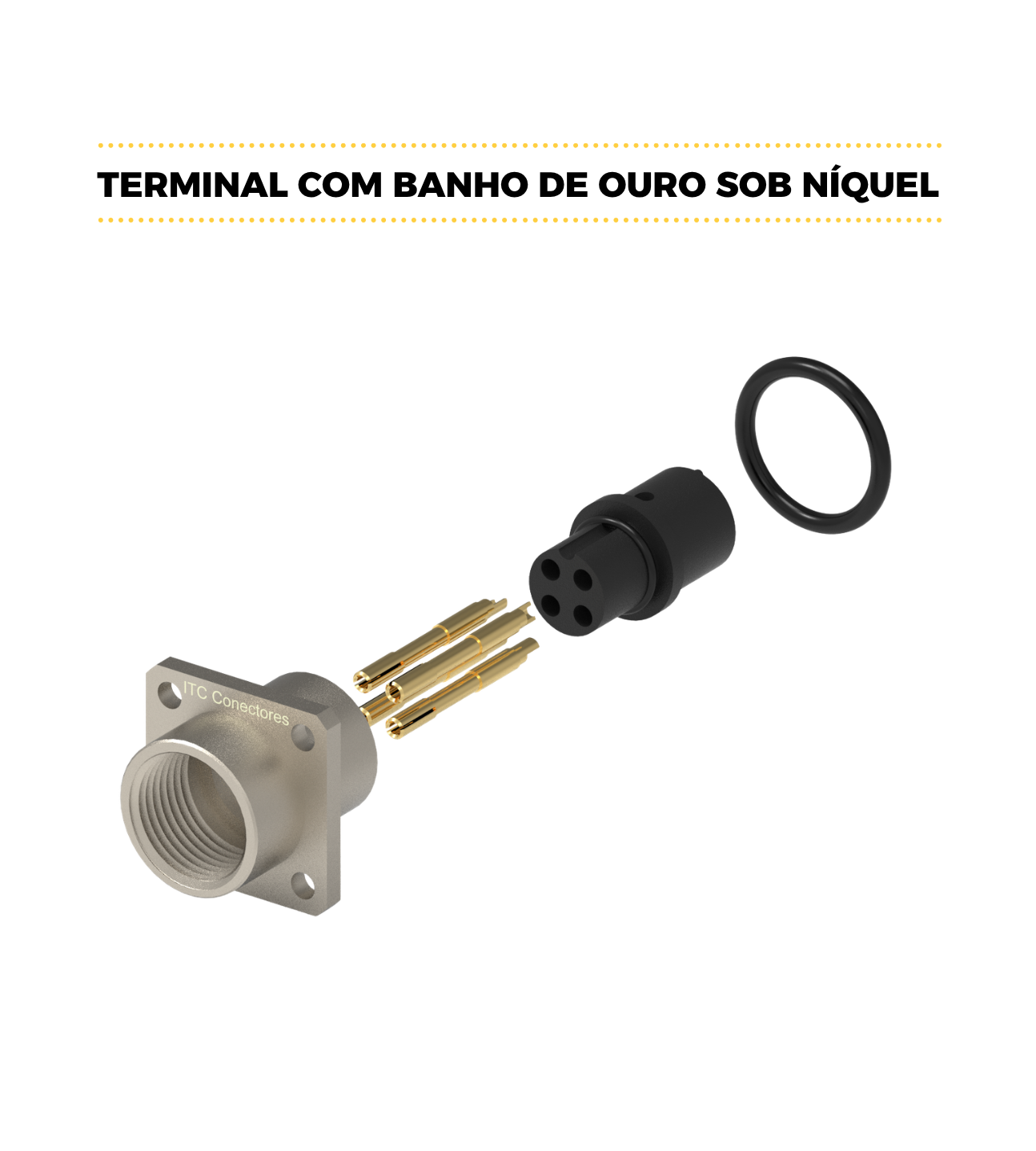 Com grau de proteção IP67, o conector assegura vedação eficiente contra poeira e resistência à imersão temporária em água, sendo indicado para aplicações em ambientes com umidade, poeira e vibração.