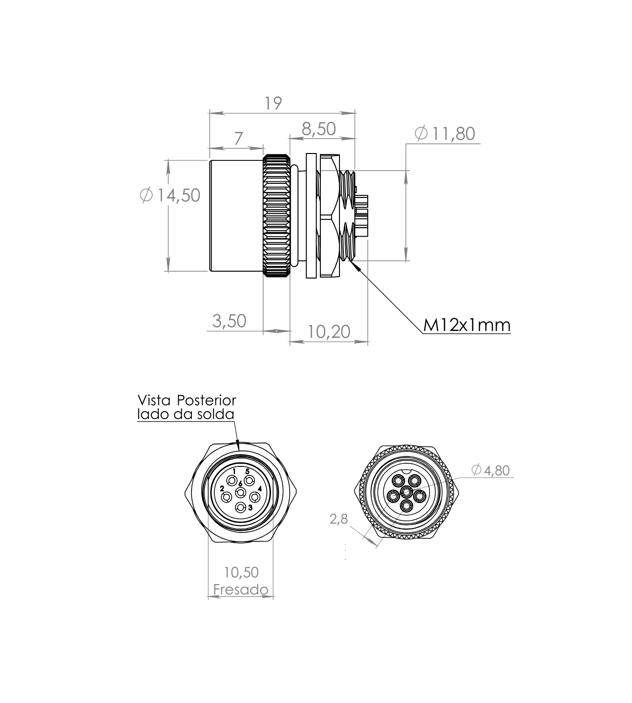 CONECTOR BASE REDONDA CIRCULAR M12 – 1 AMPERE – FÊMEA – IP67 – ALUMÍNIO 1,0-Ouro
