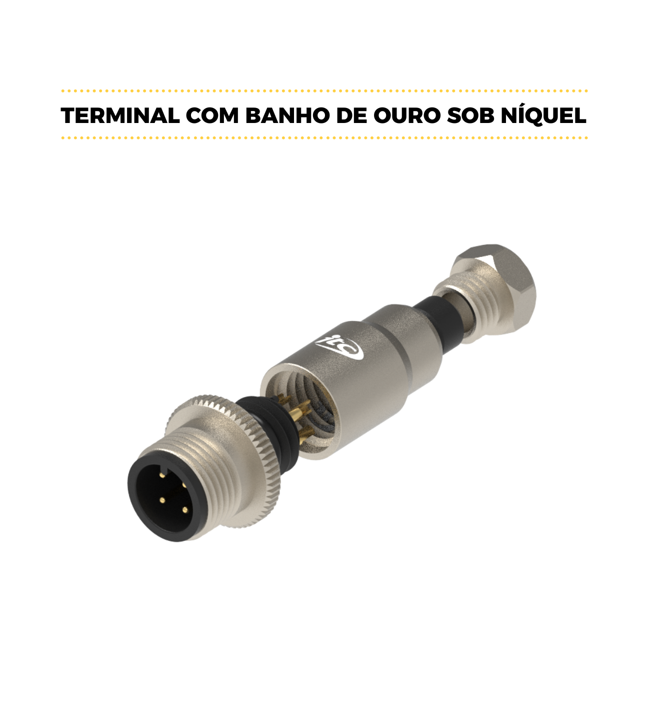 Fabricado em latão niquelado, o conector apresenta excelente resistência mecânica e proteção contra corrosão, garantindo longa vida útil mesmo em ambientes industriais exigentes. Seus contatos possuem banho de ouro, proporcionando alta condutividade elétrica, baixa resistência de contato e maior durabilidade.