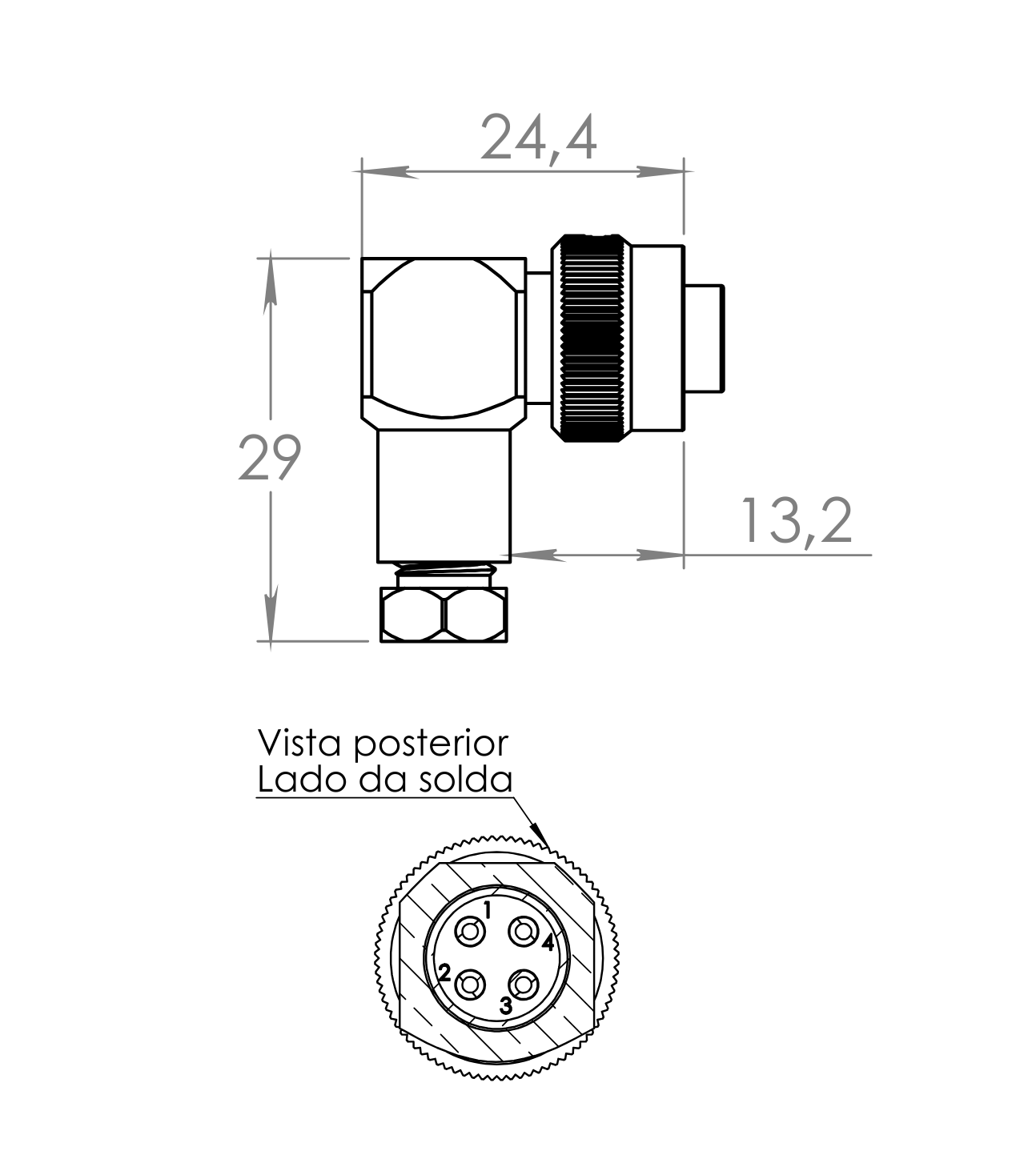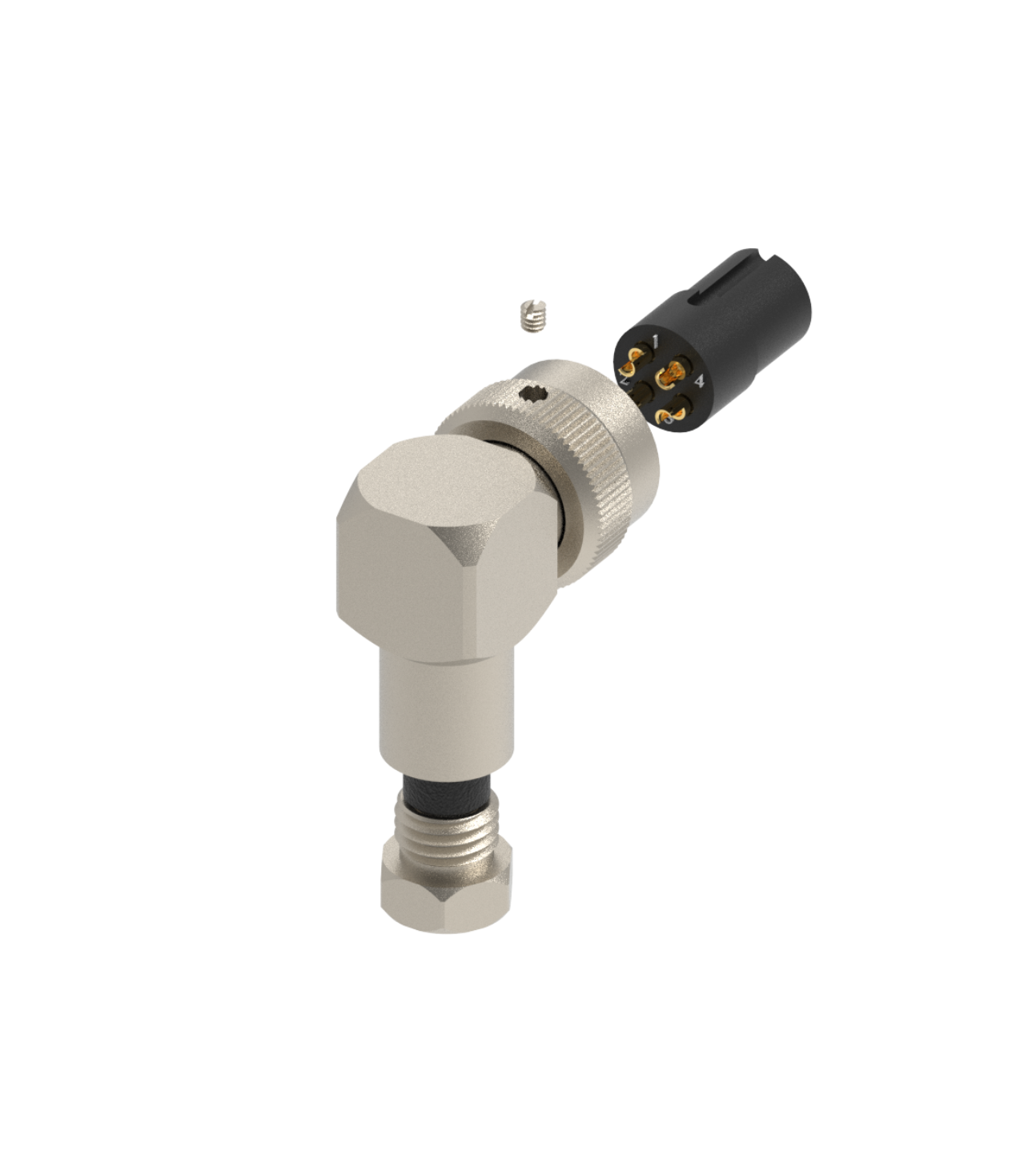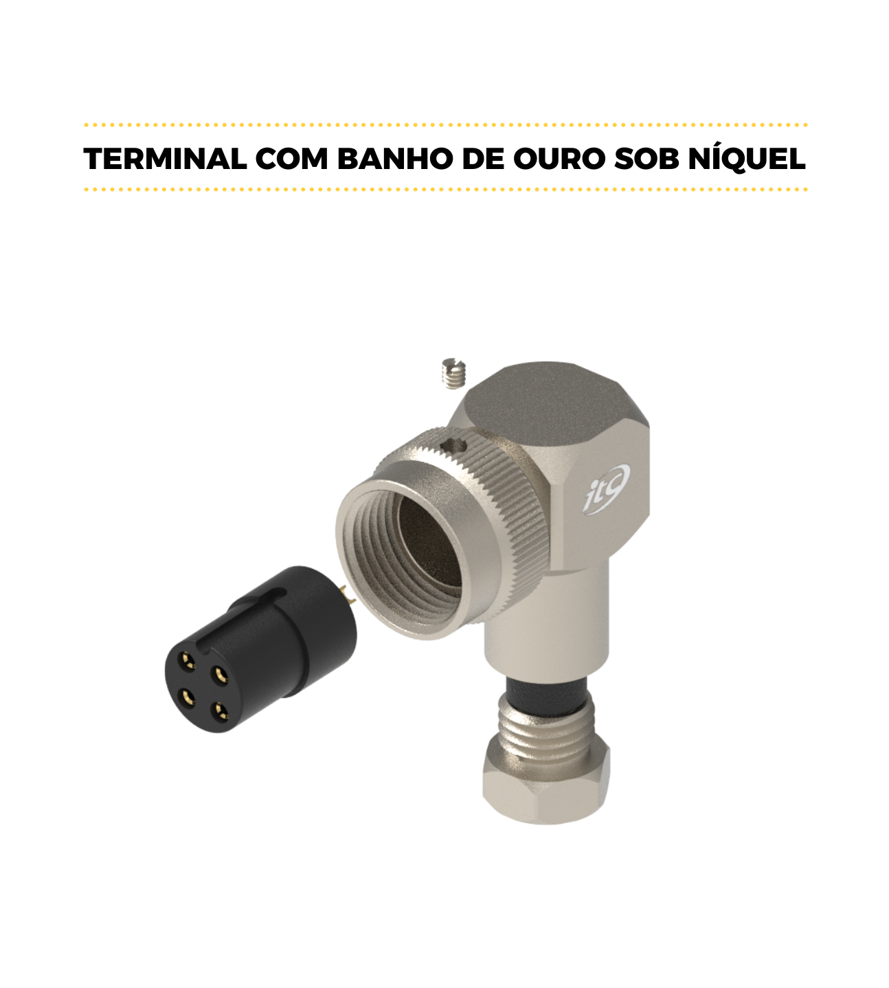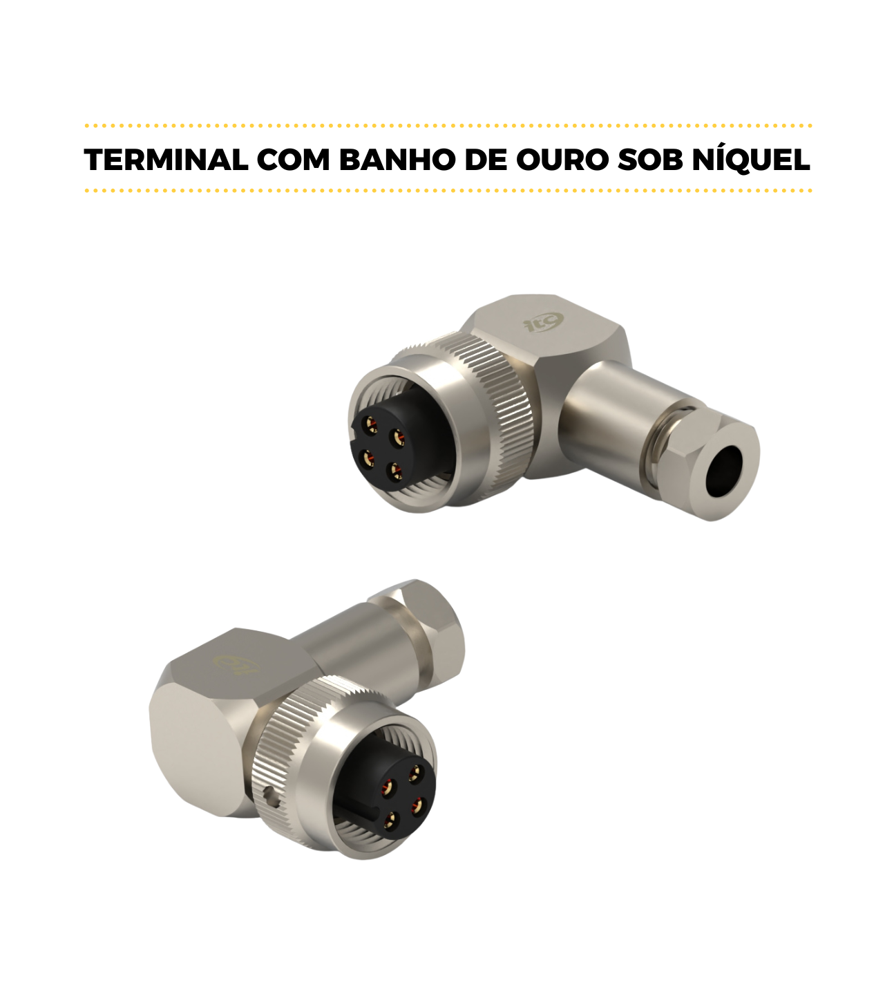 CONECTOR CABO CIRCULAR M12 90º – 1 AMPERE – FÊMEA – PRENSA CABO ITC M12 – IP60 – LATÃO NIQUELADO 1,0 OURO